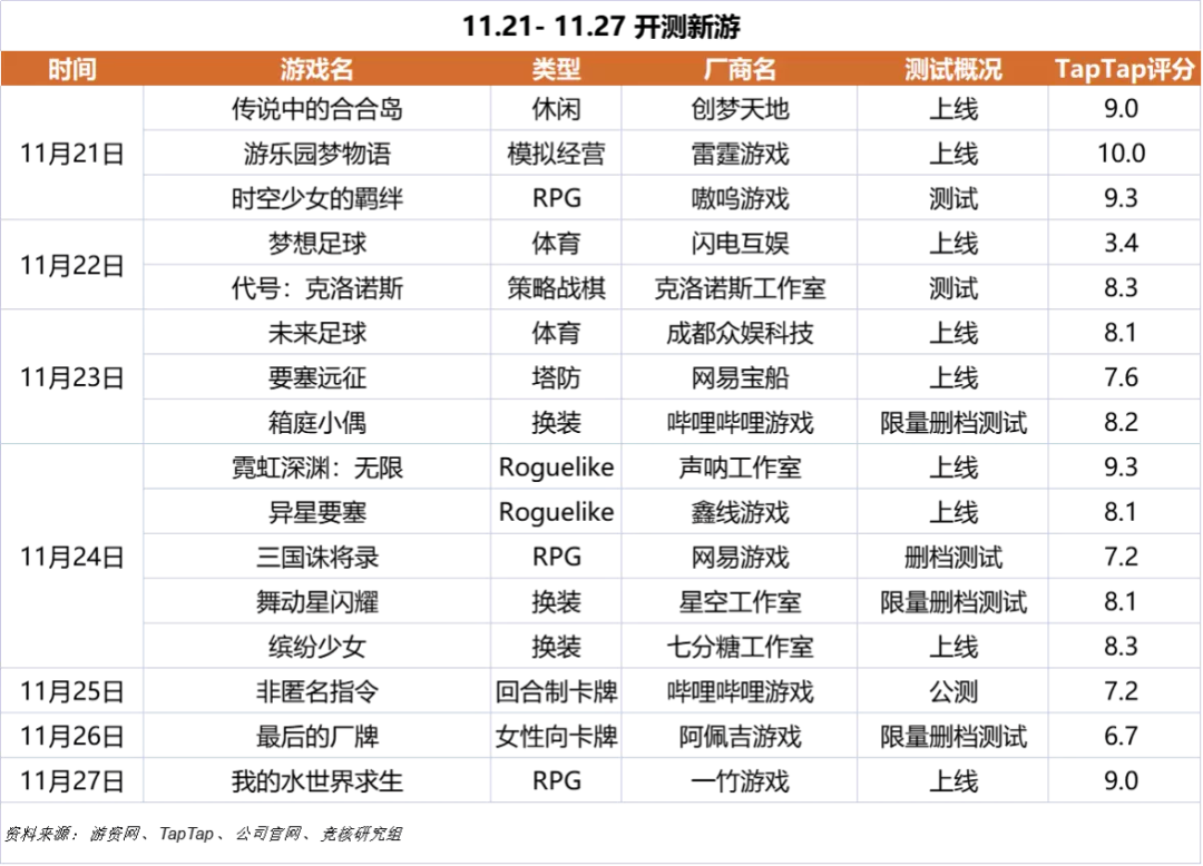 下周(11.21 - 11.27)开测新游:
