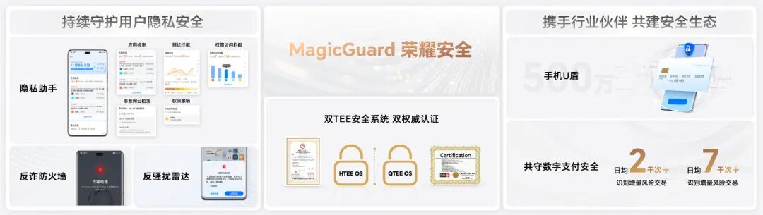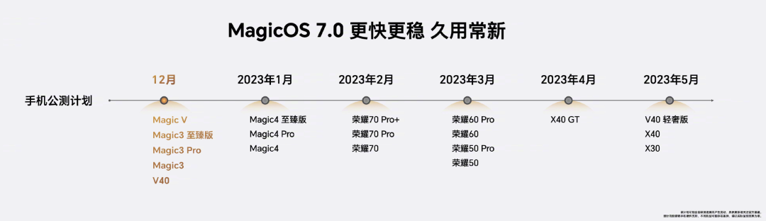 MagicOS 7.0正式亮相,并公布了四大核心技术,即MagicRing信任环、Magic Live智慧引擎、Turbo X系统引擎、MagicGuard荣耀安全。MagicRing信任环技术基于身份认证体系,可实现跨系统多设备可信互联,使服务在设备间智慧流转和共享。Magic Live拥有强大的智慧感知能力,可以一键识别图片中的文字,并提供一步直达的关联服务,且扫描文档支持直接转为PDF。基于Magic Live智慧引擎,MagicOS 7.0可以通过多意图组合推荐、多场景地理围栏泛化以及多维度快速学习,实现多场景、多维度、多意图的场景感知与意图理解。荣耀MagicOS集成荣耀OS Turbo X、GPU Turbo X、LINK Turbo X以及智能调度引擎的能力,用系统级调校、平台级重构来打造场景化流畅体验。新一代OS Turbo X可以通过AI预加载技术提升应用启动速度。GPU Turbo X基于场景识别的AI图形渲染引擎和基于场景负载的智能调度,能实现更高帧率、更低功耗的游戏体验。LINK Turbo X通过感知应用特征、提前预测和识别网络卡顿,带来高质量的通信解决方案体验。MagicGuard荣耀安全防护体系,从最底层荣耀自研安全存储芯片,到自研双TEE OS可信系统,到为MagicRing提供可信认证,为Magic Live提供隐私计算,为系统数据和三方软件应用提供生命周期安全守护。MagicOS 7.0以“Flow”为设计核心,将贝塞尔曲线升级为弹性曲线,让视觉焦点更随心。全新推出HONOR Sans字体,是业界首款支持字重和中宫双重无极可变的字体,将荣耀字体与UI融合,通过间距优化,让排版更整齐,层次更清晰。基于MagicOS 7.0,可以通过设置亲情守护,反诈提醒,为用户提供安全守护;还可以远程开启亲情定位,随时关注家人健康。荣耀MagicOS 7.0正式上线运动健康APP,通过学习用户习惯,为用户量身定制运动计划,提供300+智能建议。荣耀宣布将和比亚迪在智慧出行场景达成战略合作,在车机融合方面做联合研发,提供给消费者更好的体验。同时,荣耀出行也和百度Apollo达成合作,支持CarLife增强版。官方信息显示,MagicOS 7.0将在2023年初陆续开启老机型升级。同时,荣耀将推出“荣耀远航计划”,目前已建立PUSH、支付等完善的底层能力,并构建了应用分发、服务分发和内容分发三大分发平台。
