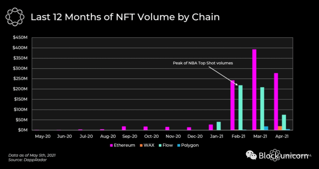 重要的是要注意这个市场变化的速度有多快,我们脚下的地面经常变化。如下图所示,Flow 几乎没有记录任何指标,直到 2021 年 1 月它以惊人的方式出现在现场。我们对 NFT 能够引起的主流关注感到鼓舞,并渴望随着它的发展而追踪这一迷人的景观。