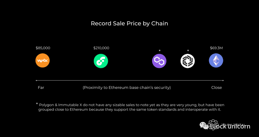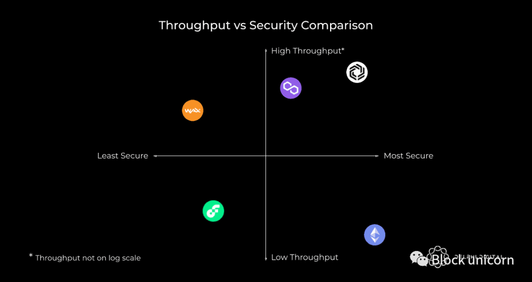 需要强调的是,不同 L1 的安全性差异很大,以太坊相对于其他 L1 而言要优越得多。Immutable X 使用StarkWare的最新前沿缩放技术构建,是唯一显示的真正的第 2 层 (“L2”) 技术。这使它能够提供比第 1 层以太坊高几个数量级的吞吐量,同时拥有与其相似的安全性。Polygon PoS、Flow和 WAX(建立在 EOS 的第 1 层上)提供较弱的安全保证。我们应该注意到,Polygon 确实有一个实时 Plasma 实现,可以将其视为具有更好安全保证的第 2 层解决方案。但是,它目前不支持任何 NFT(尽管将来会支持),这就是我们在这篇文章中忽略它的原因。相反,我们将专注于他们的 PoS 链。Polygon 还计划在未来支持其他 L2 解决方案,例如 Optimistic 和 ZK Rollups。同样,由于这些尚未上线,我们选择在此分析中忽略它们。虽然时间线不确定,但如果/何时 Polygon 增加对汇总的支持,从安全性和吞吐量的角度来看,它会将其置于与 Immutable X 类似的位置,具体取决于它们的实现。如果您有兴趣了解有关 Polygon 的更多信息,我们建议你打开下面链接链接: