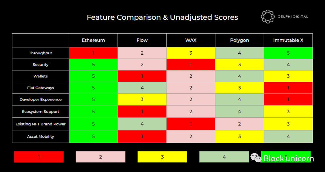 现在我们已经有机会讨论每个解决方案及其独特的属性,让我们继续我们的记分卡。如下所示,我们根据各种相互关联的关键因素对解决方案进行了排名。5 分代表其各自类别中的最佳选项,而 1 分代表最差选项。不出所料,以太坊在除吞吐量之外的所有类别中都占主导地位,这是替代方案的优势所在。毋庸置疑,这里肯定存在一定程度的主观性,尽管我们已尽力提供理由。下面,我们将逐一介绍这些类别、它们的含义以及影响我们评分的因素。