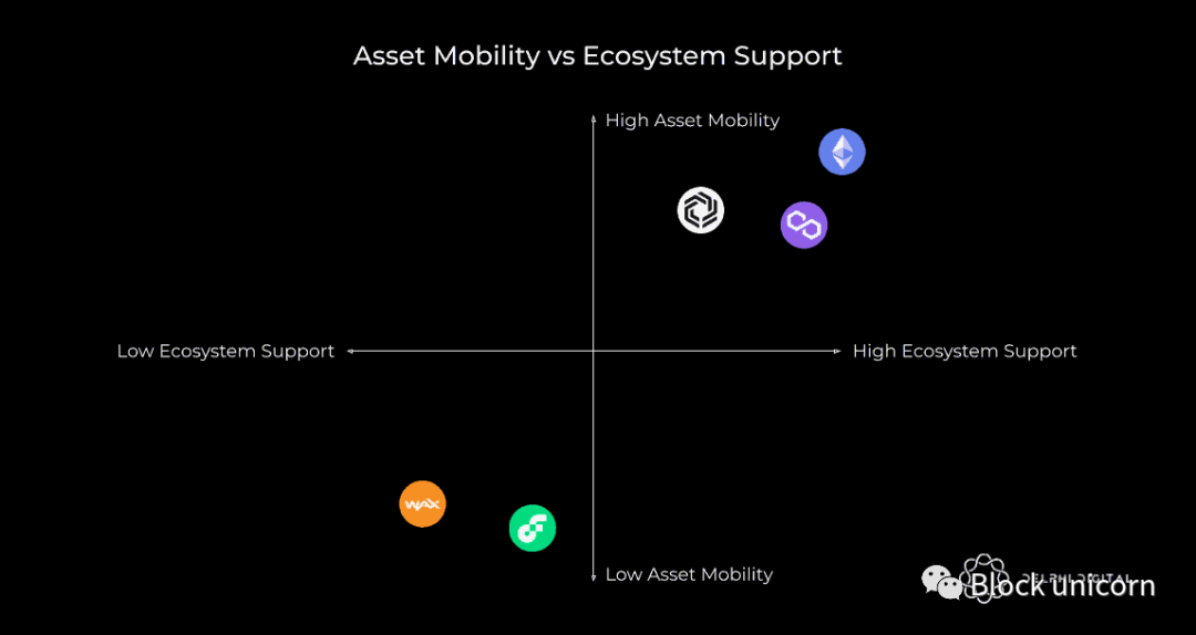 接下来,我们评估了这些平台的资产流动性和生态系统支持。在这种情况下,资产流动性是指 NFT 可以轻松地从一个链或扩展解决方案转移到另一个链(例如提款到以太坊 L1)。生态系统支持着眼于可以轻松插入解决方案并利用通过它创建的资产(例如 OpenSea 支持)的优质应用程序的数量。对于同时提供两者的平台,代币持有者将受益于可以自由地将资产转移到任何他们喜欢的地方,并从如何使用资产中体验更大的效用。