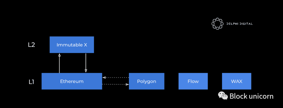 不可变 X 在这里处于独特的位置。它所在的 Starkware 构建的 L2 实现了新开发的CAIRO编程语言,这意味着还没有多少开发人员熟悉它。此外,现有代码不能像 Polygon 那样轻松地从以太坊移植到它。话虽如此,我们在上图中将其标记为“半兼容”,因为它与以太坊互操作并使用相同的令牌标准。无论 NFT 最初是在哪里创建的,无论是在 Ethereum、Polygon还是Immutable X 上,资产可以在它们之间流动,尽管速度不同。从技术角度来看,Immutable 可以促进 NFT 更快地撤回以太坊,而不会影响安全性,使其在资产流动性方面优于 Polygon。