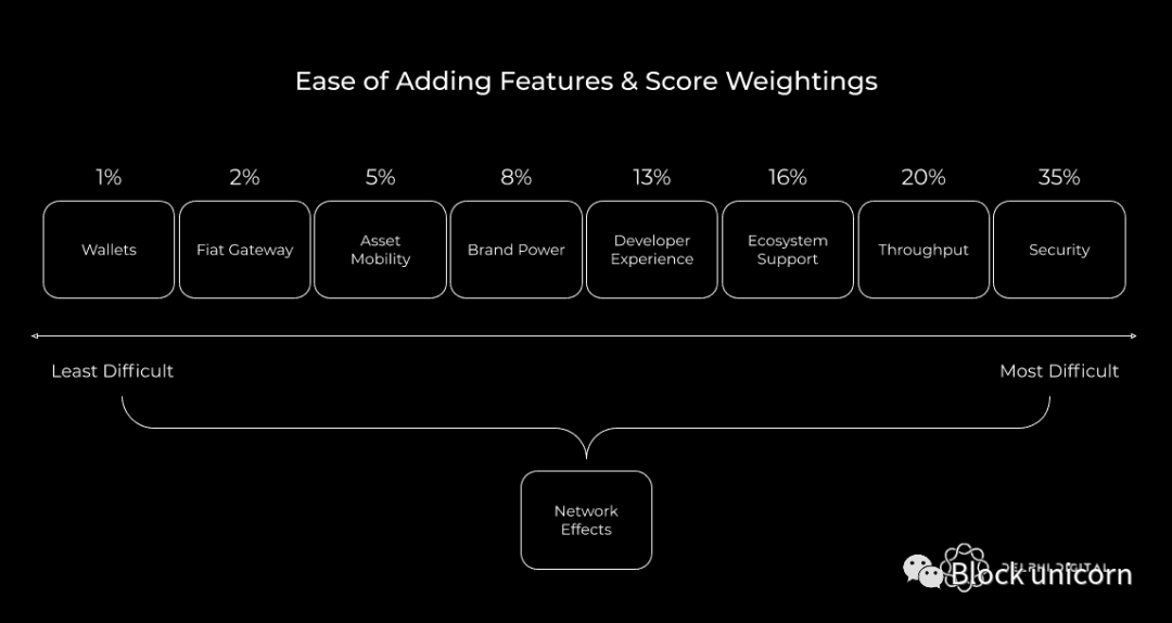 虽然上述分数本身很有帮助,但它们缺乏细微差别和背景。并非所有类别都同等重要,有些类别比其他类别更难改进。例如,解决方案增加对钱包的支持要比突然提供更好的安全性和吞吐量容易得多。后者可能需要对设计架构进行大修和重建。考虑到这一点,我们着手对类别本身进行排名,以便我们可以使用权重来调整之前的分数。最终目标是使评分对我们的读者更有用。我们得出的框架如下图所示。