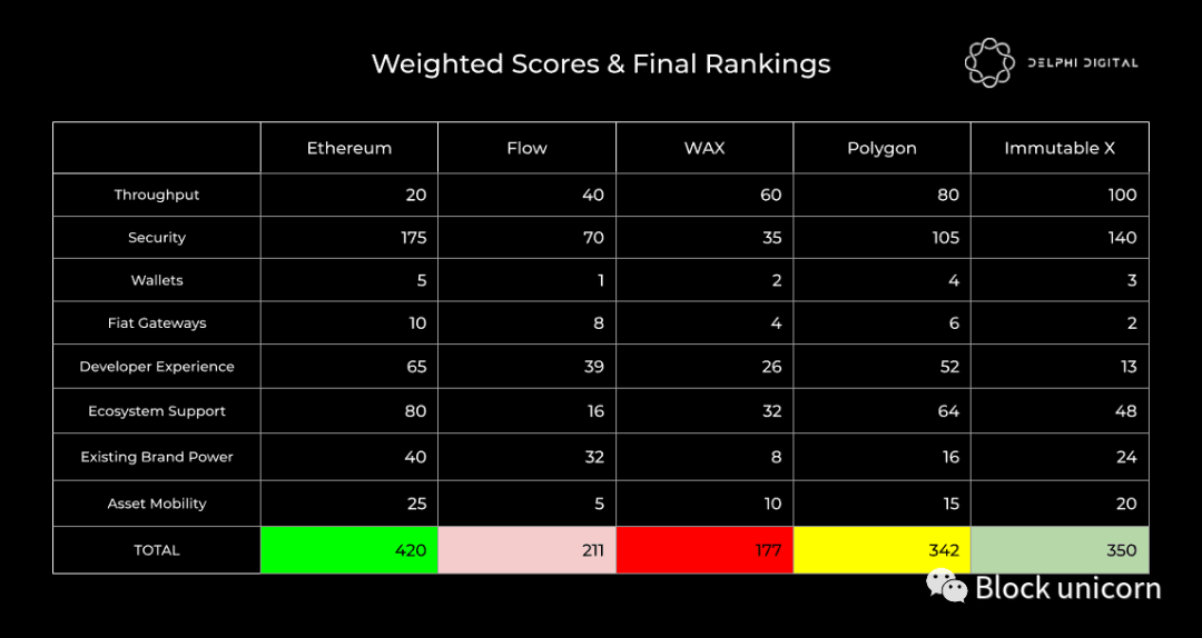 接下来,我们评估了安全性。这篇文章的很大一部分已经专门讨论了这个主题,所以我们将保持简短。Immutable X 所在的 Starkware 构建的第 2 层可以提供接近以太坊的安全保证,尽管这可能会有所不同,这就是它排名第二的原因。Polygon 排在第三位,因为它有大约 100 个验证器的未经许可的集合。Flow 紧随其后,尽管目前高度集中。正如我们之前提到的,随着时间的推移,Flow 可能会变得更加去中心化,我们个人认为,与 WAX 所依赖的 21 个验证者组成的 EOS 卡特尔相比,Dapper Labs 团队操纵的机会更少。