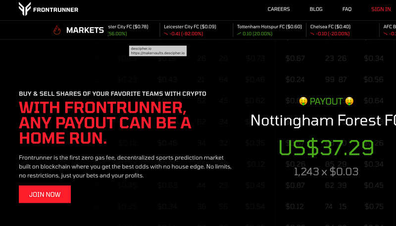 Frontrunner 是一个建立在 Injective 上的去中心化的体育预测市场,用户可以在其中买卖体育主题的股票,并像交易股票一样进行交易。与用户下注并等待的传统体育博彩不同,Frontrunner 让用户可以完全控制他们的投资组合,允许他们随着赔率的变化动态地买卖头寸。特点是快速交易并且无 Gas 费。