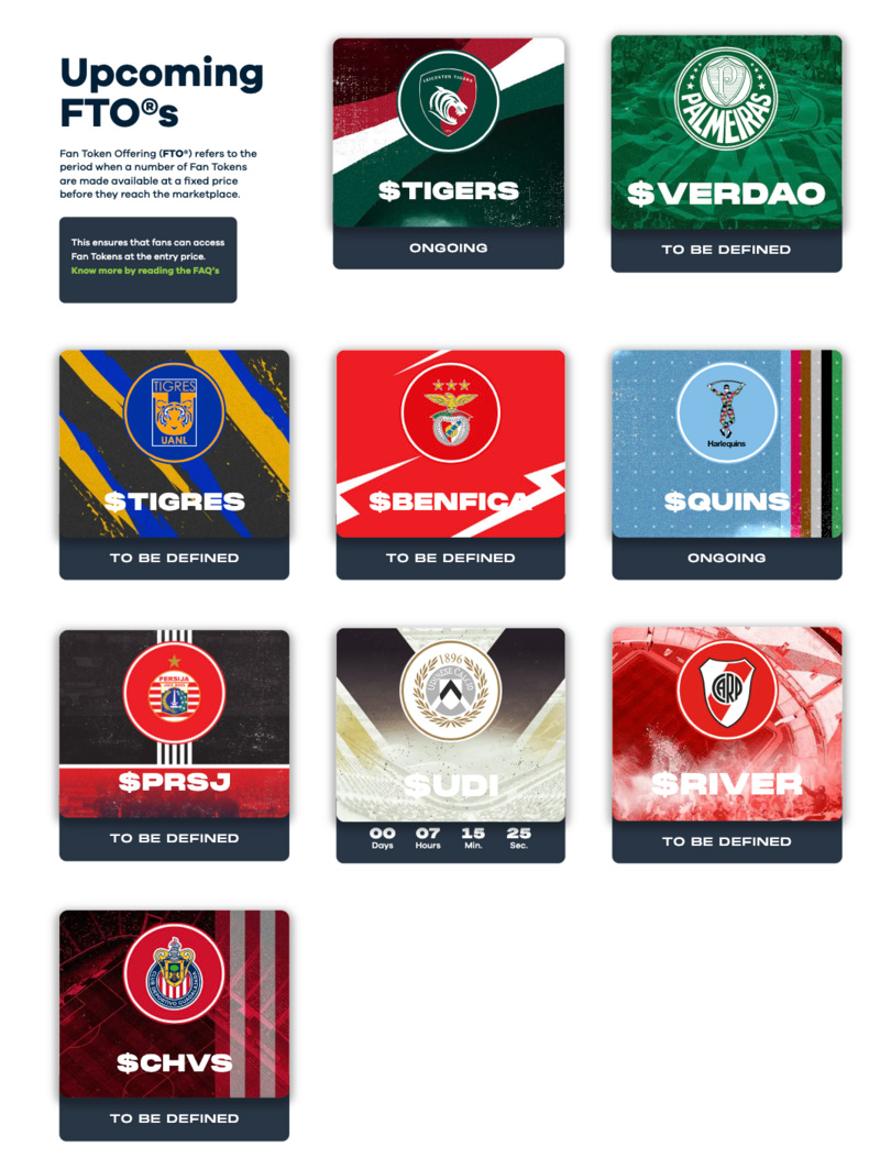 除了现有的粉丝代币以外,Chiliz 平台的粉丝代币发行 (FTO) 启动板,还会在近期上线多个新的粉丝代币为世界杯预热。可以在该网站上查找相关信息。