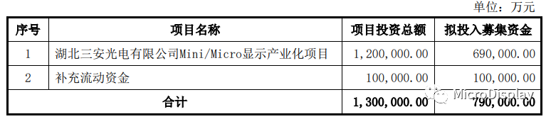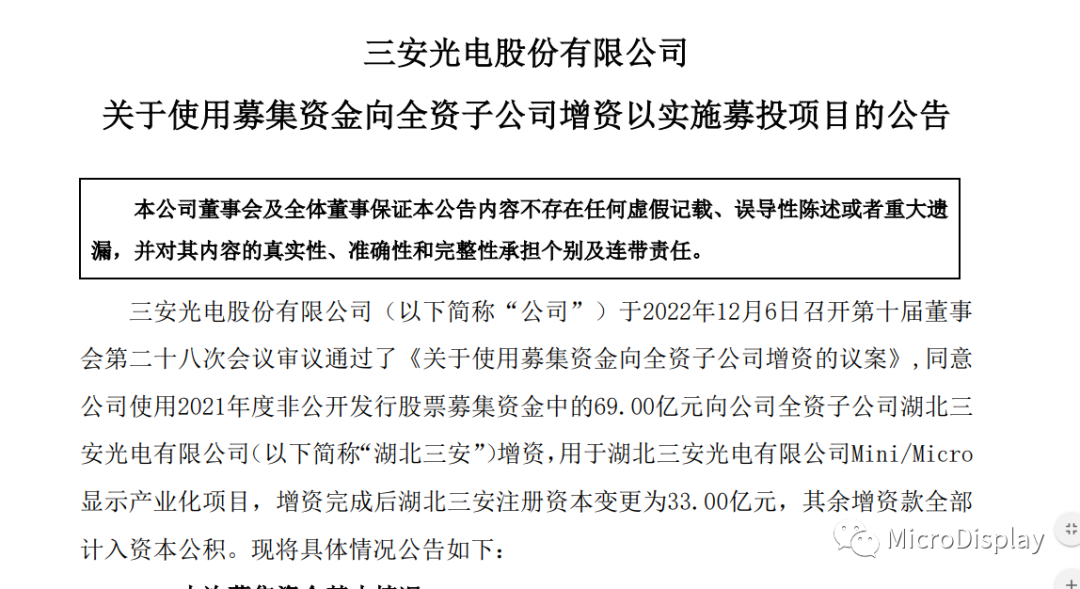据悉,湖北三安光电有限公司Mini/Micro显示产业化项目由全资子公司湖北三安负实施。截至本公告日,湖北三安注册资本30.00亿元,实缴资本5.07亿元。为推进募 投项目顺利实施,公司拟使用募集资金69.00亿元向湖北三安增资,增资完成后湖北三安注册资本变更为33.00亿元,其余增资款全部计入资本公积。本次增资完成后,湖北三安注册资本为33.00亿元,仍为公司全资子公司。本次使用募集资金向湖北三安增资,仅用于募投项目实施,不作其他用途。