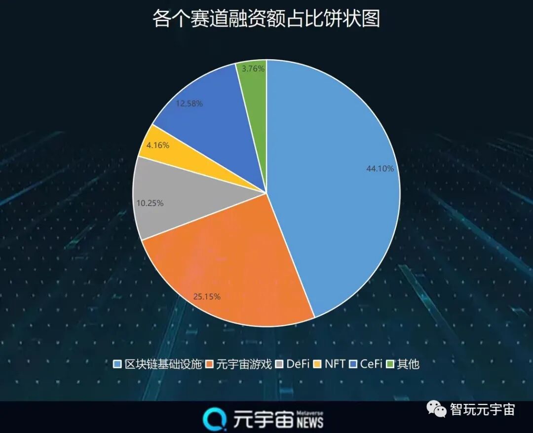 从赛道来看,区块链基础设施13个项目获得4.56亿美元;元宇宙游戏17个项目获得2.6亿美元;CeFi中心化金融各领域18个项目获得1.29亿美元;DeFi去中心化金融12个项目获得1.06亿美元;NFT数藏领域11个项目获得0.43亿美元。