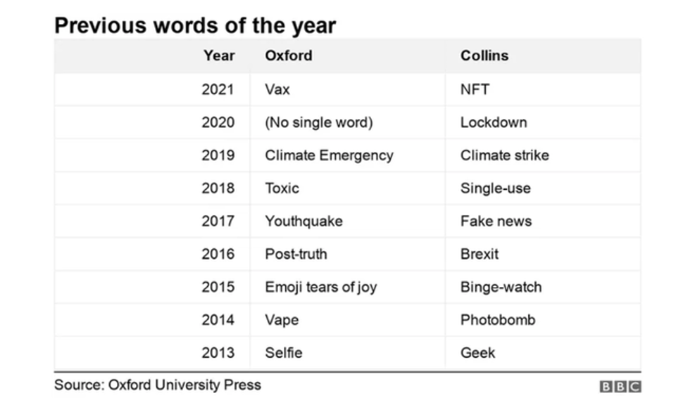 图 | 2013-2021年牛津年度热词(第一列)与柯林斯年度热词(第二列)