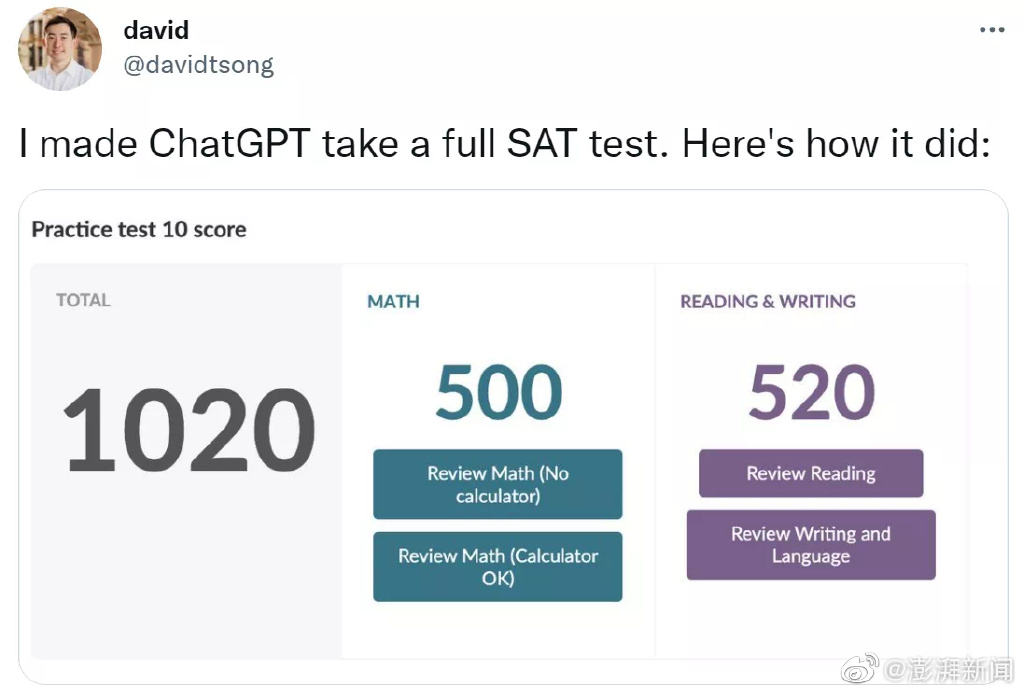 比如,有人让它去参加被称为“美国高考”的SAT考试,结果ChatGPT不负众望地拿到了还算不错的分数,超越了现实中半数参与过该考试的美国人,