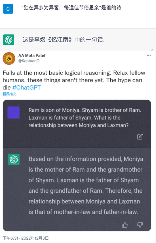 指望靠ChatGPT缓解做题焦虑的学生党们,也不要高兴得太早。就目前来说,ChatGPT的智商,还远没有达到包教包会、包做包对的级别。无论是国外网友用简单的题目,测试其基本的逻辑思维能力,还是国内网友用古诗词,测试其中文数据库的完善程度,基本都能碰上一些让人哭笑不得的问题。指望聊天AI真正能代替人脑,显然还是不太现实的。