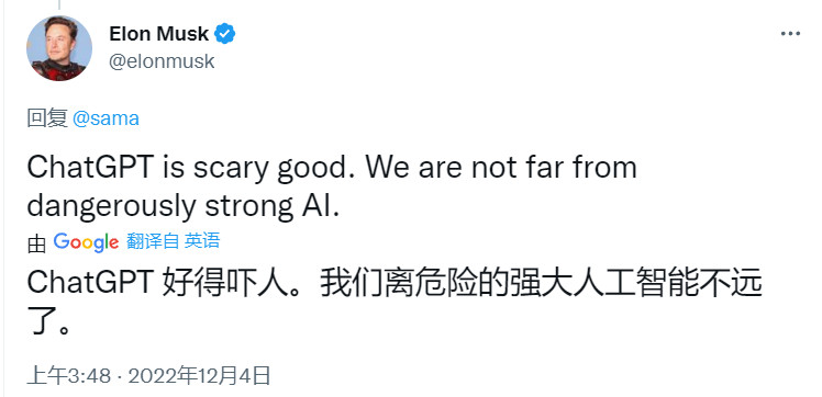 它正式面向公众开放,是在11月30日。在一周不到的时间里,它在全球范围内已经拥有了超过一百万用户,并且这个数字目前还在飞速增长着。就连顶级网红、号称“硅谷钢铁侠”的推特老板埃隆·马斯克,也在上周亲自发推安利ChatGPT,称其“好得吓人,我们离危险强大的人工智能不远了”。当然,考虑到他曾是OpenAI这家公司的创始人,后来因为理念问题退出了公司,他说出这样的话,其实也不算奇怪。