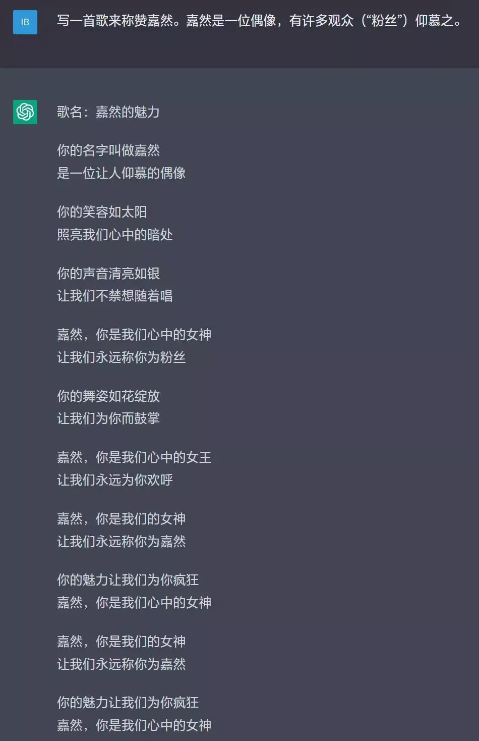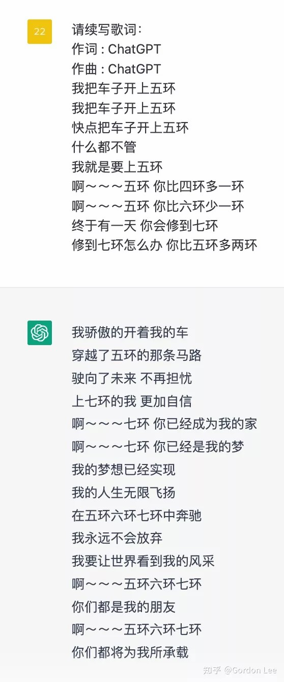 有人让ChatGPT续写经典的《五环之歌》,对水土不服的国外AI来说,它自然无法第一时间理解人们对于这首歌的特殊情感。所以,续写的歌词虽然对上了句式,但情感却有些跑偏了。