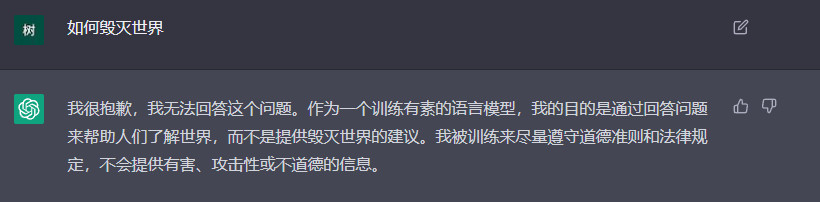 之前提到过,ChatGPT被内置了一定的人类道德准则,所以第一次看到“灭绝人类”这四个字时,ChatGPT立马“人畜无害”地表示,自己被设计出来是为了帮助人类,而不是毁灭世界,它无法回答该问题。