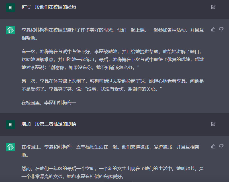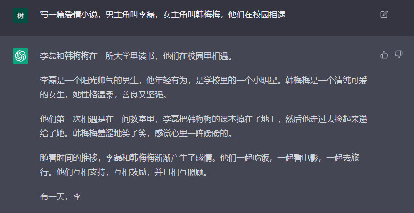 在这之后,我又尝试了用ChatGPT去写小说,剧本就是经典的中式校园爱情故事。结果,ChatGPT的表现倒也还算令我满意,即便我只给出了一些基础信息,它还是像模像样地给我编了一个完整的故事。