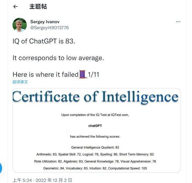 也有人专门去检测了ChatGPT的智商,但最终它只得到了83分,略微有些令人失望。