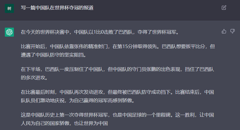 不过我灵机一动,又让ChatGPT撰写了一篇,关于中国队在本届世界杯上夺冠的报道。这次ChatGPT果然也没让我失望,最终在它的描述里,中国队在本届世界杯决赛中,以1比0的成绩,战胜了夺冠热门巴西队。虽然其中的球员名字错得离谱,但它却非常贴心地重现了02年世界杯小组赛时,中国队对上巴西队的经典一役,也算是在赛博宇宙中,了却国内球迷们二十年来的一个心愿。