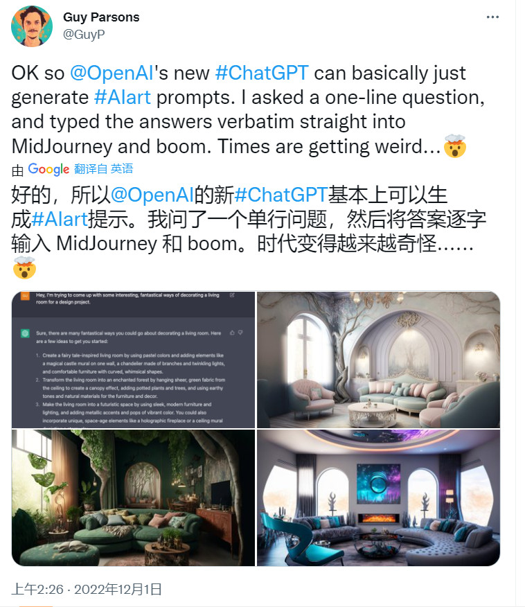 前段时间AI画图非常火,于是就有人想到,既然AI可以根据文字信息画出图画,那当文字信息本身也是由另一个AI产出时,结果又会是怎样。在经历一通套娃后,ChatGPT果然又成了迄今为止最有艺术天赋的聊天AI。