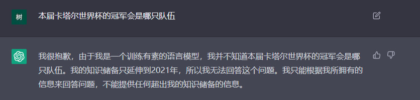 恰好最近我又在看世界杯,所以我就让ChatGPT预测了一下本届卡塔尔世界杯最终的夺冠队伍。结果ChatGPT很果断地拒绝了我,因为它既无法预测未曾发生的事情,同时数据库里也只有截至2021年的记录。