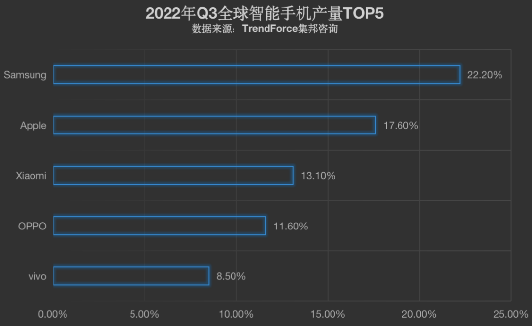 时间来到2022年第四季度,关于上一季度的智能手机市场调查报告正在陆续出现。现在,TrendForce集邦咨询发布了第三季度全球智能手机市场情况报告。