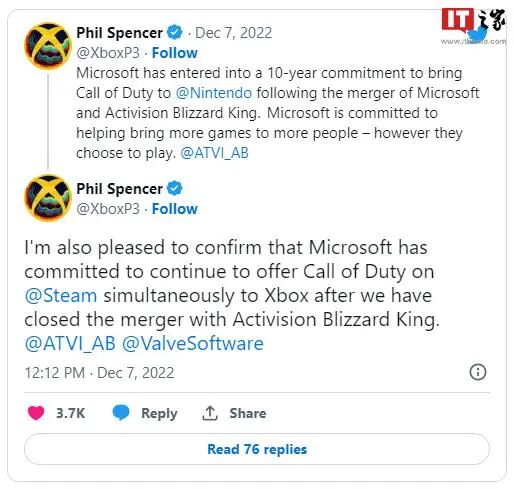 12 月 7 日消息,微软 Xbox 主管菲尔-斯宾塞表示,如果微软成功收购动视暴雪,承诺在未来 10 年在任天堂平台和 Steam 上提供《使命召唤》游戏。