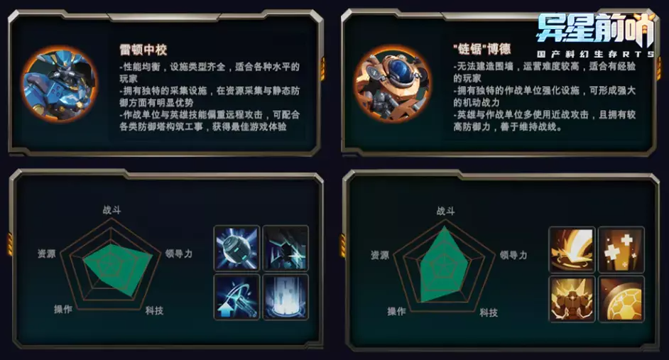 而《异星前哨》的英雄与其说他是英雄,不如说一个英雄就代表了一个种族,每一个英雄都有对应的技能、建筑、兵种、增益,选择英雄就相当于选择种族。
