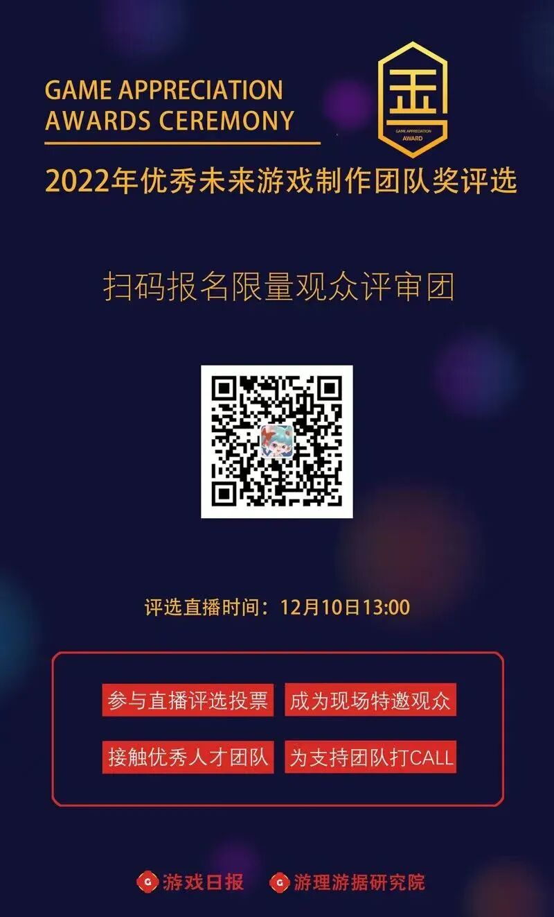 此外,第九届游戏行业金口奖【2022年优秀未来游戏制作团队奖】入围名单已于12月2日公布(点击跳转查看),最终决赛将于12月10日以线上方式公开举行,本次线上评选的限额观众评审席位火热报名中,有意报名观众评审团的朋友可点击下方海报二维码或添加游戏日报宝姐(youxiribao666)报名。