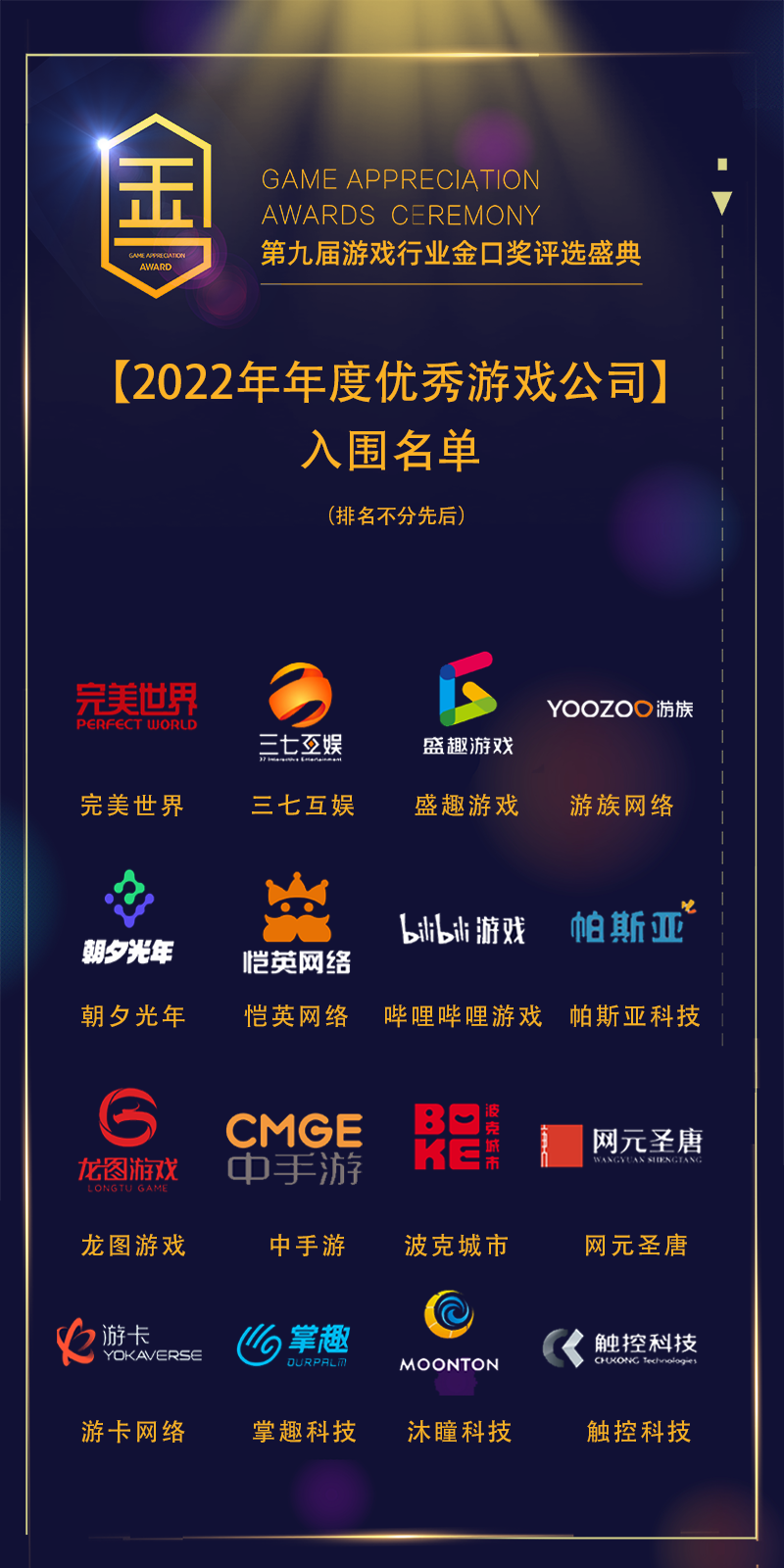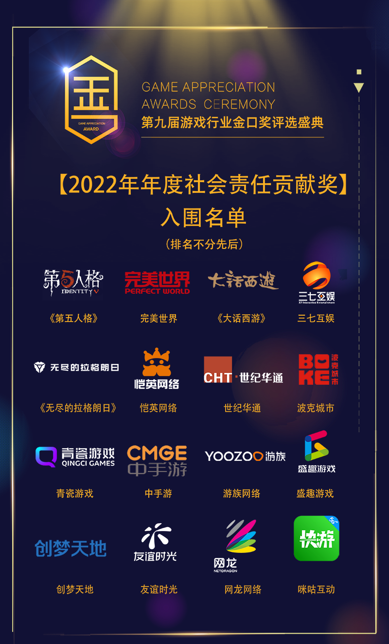 《第五人格》、完美世界、《大话西游》、三七互娱、《无尽的拉格朗日》、恺英网络、世纪华通、波克城市、青瓷游戏、中手游、游族网络、盛趣游戏、创梦天地、友谊时光、网龙网络、咪咕互动。