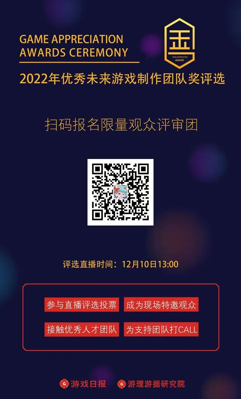 第九届游戏行业金口奖【2022年优秀未来游戏制作团队】奖项评选结果将于12月10日以线上直播的方式公布,同时本次线上评选活动还将开设限额数量的观众投票通道,有意参与线上直播评选投票的小伙伴,可点击下方海报二维码或添加游戏日报宝姐(youxiribao666)报名。