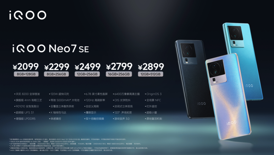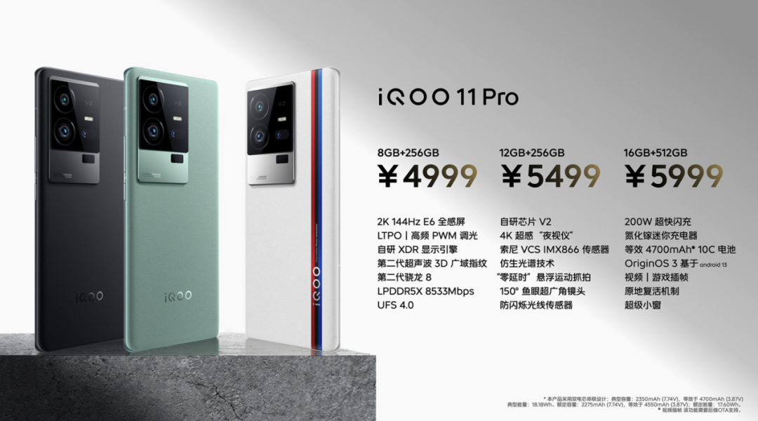 活动中提到,作为安卓旗舰,iQOO数字系列在线上市场份额已常年超过20%。提供三款配色可选,传奇版采用白色有机硅皮革搭配传奇三色,结合巴黎钉纹装饰;曼岛特别版采用绿色有机硅皮革搭配微米级玻璃纤维基材,更薄却带来更高强度;赛道版采用萤石AG工艺玻璃,触感舒适不易沾指纹。iQOO 11系列首批搭载第二代骁龙8,能耗比提升40%;UFS 4.0读取速度提升至200%;LPDDR5X运行速度提升1/3;安兔兔跑分突破130万。iQOO 11系列采用创新3D双层主板,快速导热,结构强度更高、器件稳定性更好。VC均热板采用一体压铸工艺,散热效率更高;自研低温感航空铝中框,兼具金属质感与舒适手感;智能温度传感器实时监测温度,还可以OTA升级散热策略。iQOO 11系列芯片支持平台硬件级光追算力,还自研FALCON图形引擎,结合AI算法和底层计算加速能力,真实还原阴影、材质等画面细节。iQOO 11系列配备6.78英寸AMOLED屏幕,E6发光材料,3200×1440,144Hz刷新率。拥有自研屏幕色准算法、分区刷新技术、护眼的高频PWM调光、MVP微操模式。其中,iQOO 11采用直面屏设计,iQOO 11 Pro采用曲面屏设计。iQOO 11系列搭载V2芯片,突破原生帧率实现144FPS,插帧支持“爱奇艺、优酷、腾讯视频、哔哩哔哩”等平台,带来4K超感“夜视仪”。iQOO 11配备5000万像素GN5 超感光主摄、1300万像素人像镜头、800万像素超广角镜头。iQOO 11 Pro配备5000万像素 VCS IMX866超清主摄、5000万像素150°鱼眼超广角微距镜头、1300万像素人像镜头。iQOO 11系列支持超声波3D广域指纹解锁。拥有11倍超大识别区域,晚上解锁不用亮屏也能随时按,还支持APP自定义。iQOO 11 Pro内置4700mAh电池,支持200W超快闪充;iQOO 11内置5000mAh电池,支持120W超快闪充。iQOO 11,8GB+128GB版本3799元、8GB+256GB版本4099元、12GB+256GB版本4399元、16GB+256GB版本4699元、16GB+512GB版本4999元。iQOO 11 Pro,8GB+256GB版本4999元、12GB+256GB版本5499元、16GB+512GB版本5999元。全球首发天玑8200,安兔兔跑分突破90万分,升级LPDDR5+UFS3.1,全覆盖立体散热系统总面积达35090mm。iQOO Neo7 SE内置5000mAh双电芯电池,配备120W超快闪充。配备6.78英寸120Hz高刷柔性直屏,支持HDR 10+和SGS 低蓝光认证,双10倍触控微操提升跟手性,封闭式立体双扬声器,120°声场拓宽算法。iQOO Neo7 SE配备6400万像素高清主摄,支持OIS光学防抖,还配备了200万虚化镜头、200万微距镜头。iQOO Neo7 SE采用摄像头模组“胶片云阶”设计,整机厚8.58mm,重量193g,提供电子蓝、星际黑、银河配色可选。iQOO Neo7 SE,8GB+128GB版本2099元、8GB+256GB版本2299元、12GB+256GB版本2499元、16GB+256GB版本2799元、12GB+512GB版本2899元。