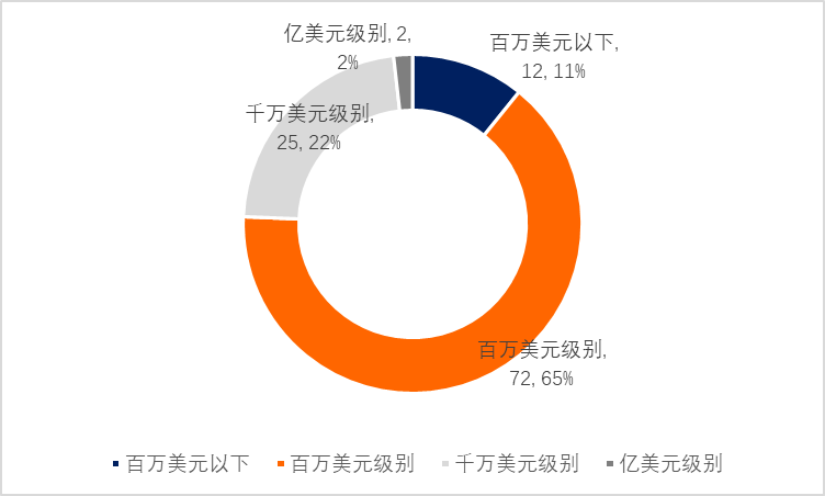 在11月份已透露融资额的项目中,65%的获投项目融资额在 100—1000万美元区间;千万美元、百万美元以下、数亿美元级别的融资事件分别占22%、11%和2%。