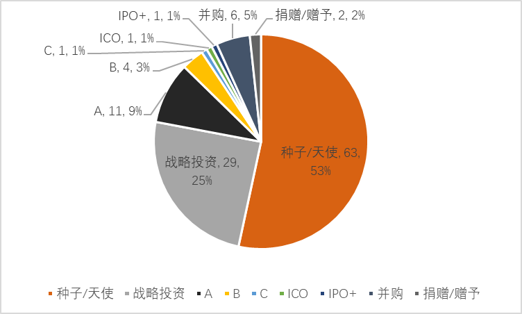 从融资轮次方面观察,早期融资占据绝对地位。种子天使、战略投资、A轮系列(包括Pre-A、A和A+轮)以及B轮是11月份区块链领域的主要融资形式,分别发生了63起、29起、11起和4起,占比53%、25%、9%和3%。