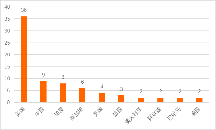 从区域看,11月份美国以单月36起融资事件领先,比10月份稍有所下降。中国、印度和新加坡分别以单月9起、8起和6起紧随随后,英国和法国分别为4起和3起,澳大利亚、阿联酋、巴哈马和德国均为2起。