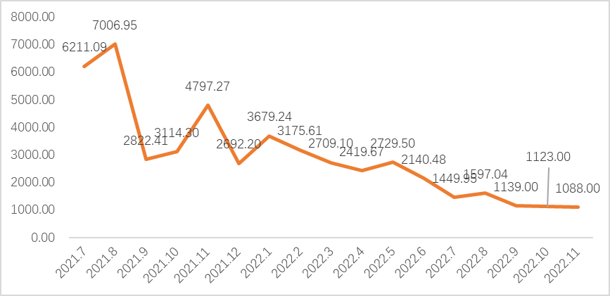 根据已公开融资金额项目计,各月单个项目平均融资额在2022年11月份降至1088万美元/起,进一步加强今年以来的下滑趋势。