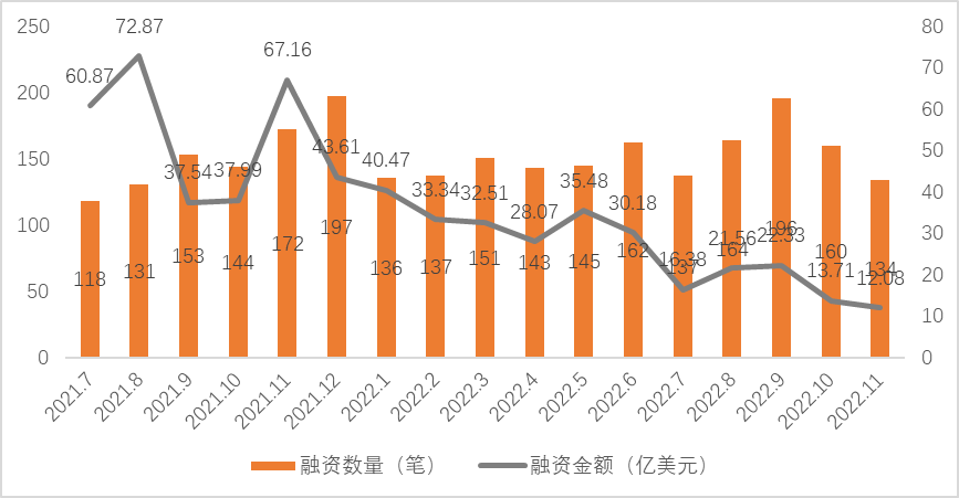 从近一年全球区块链相关融资情况看,单月平均多发生140起融资事件,其中2021年12月份最高,为197起。融资金额上,近一年呈现下滑趋势。2022年11月,单月融资额为12.08亿美元,这一数值相较10月继续小幅下降,同比减少约80%。
