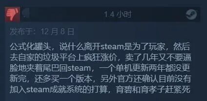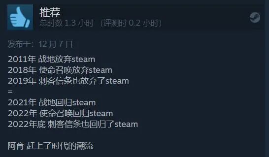 2022年底 刺客信条也回归了steam 专门下100多G下来开5分钟给你留个差评,虽然你现在成就卡牌都不做就爬回来捞钱的样子很狼狈,但你前年独占Epic给腾讯和Timmyboy当狗的样子真的好靓仔。 炒嫂子剧情我不是很喜欢 因为我没有哥哥 但是我有两个弟弟 2019:我育碧就算饿死在外边 也不会在再吃你一口steam的饭