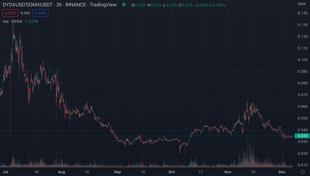 尽管它在许多方面领先于竞争对手,但 DYDX 在过去六个月中相对于 GMX 下跌了 53.3%。因此,尽管 DYDX 似乎拥有更好的产品,但去中心化永续赛道似乎也在印证:在加密行业中,产品不是代币。