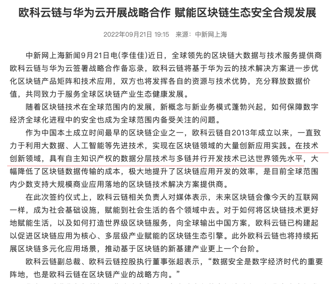 而多链生态的发展,离不开底层技术研发。早前华为云合作现场欧科云链曾向中新网记者表示,自2013年成立以来,欧科云链在技术创新领域,具有自主知识产权的数据分层技术与多链并行开发技术已达世界领先水平,是目前全球范围内少数支持大规模商业应用落地的区块链技术解决方案提供商。