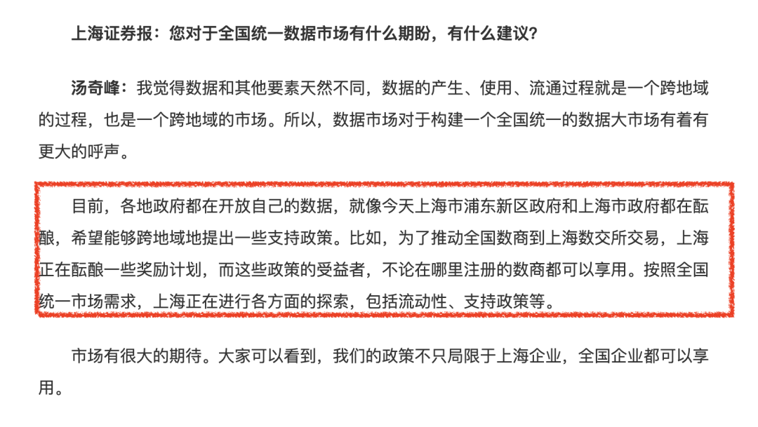 针对数据市场日新月异的发展,在此次上海主论坛上,上海数交所总经理汤奇峰向上海证券报记者透露,目前各地政府都在开放自己的数据,就像今天上海市浦东新区政府和上海市政府都在酝酿,希望能够跨地域地提出一些支持政策,帮助推动数据大市场的构建。