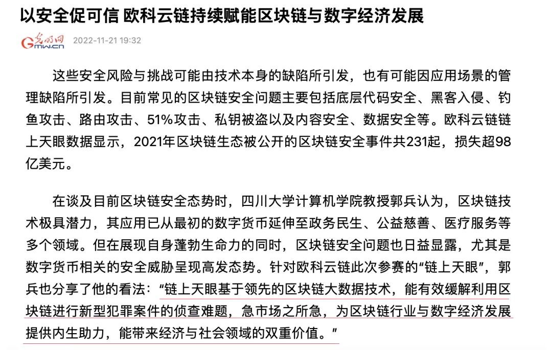 同时据光明网消息,此次大赛评委四川大学计算机学院教授郭兵对欧科云链参赛的链上天眼产品亦表达了高度肯定:“链上天眼基于领先的区块链大数据技术,能有效帮助缓解新型犯罪案件的侦查难题,急市场之所急,为区块链行业与数字经济发展提供内生助力,能带来经济与社会领域的双重价值。”