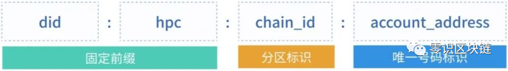 DID标识:数字身份由DID进行标识,因此该DID标识应该具有应用内唯一性、跨应用自发性的特性。DID标识符合符合W3C规范,主要包含3个部分:固定前缀“did:hpc”、分区标识“chain_id”、唯一号码标识“account_address”。