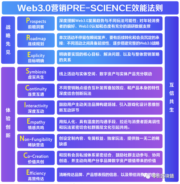 Web3时代,人们更注重精神层面的共识。所以品牌商要想做好营销,就需要基于整体性的前瞻战略思考洞察,创新升级与消费者的互动方式。基于此,凯度根据Web3营销特点,提出PRE-SCIENCE效能法则。该法则是以Web3思维支撑,以虚实共生的互动为中心的营销沟通方法论。