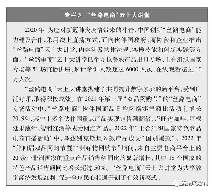 “丝路电商”合作成果丰硕。自2016年以来,中国与五大洲23个国家建立双边电子商务合作机制,建立中国-中东欧国家、中国-中亚五国电子商务合作对话机制,通过政企对话、联合研究、能力建设等推动多层次交流合作,营造良好发展环境,构建数字合作格局。电子商务企业加速“出海”,带动跨境物流、移动支付等各领域实现全球发展。积极参与世界贸易组织、二十国集团、亚太经合组织、金砖国家、上合组织等多边和区域贸易机制下的电子商务议题讨论,与自贸伙伴共同构建高水平数字经济规则。电子商务国际规则构建取得突破,区域全面经济伙伴关系协定电子商务章节成为目前覆盖区域最广、内容全面、水平较高的电子商务国际规则。