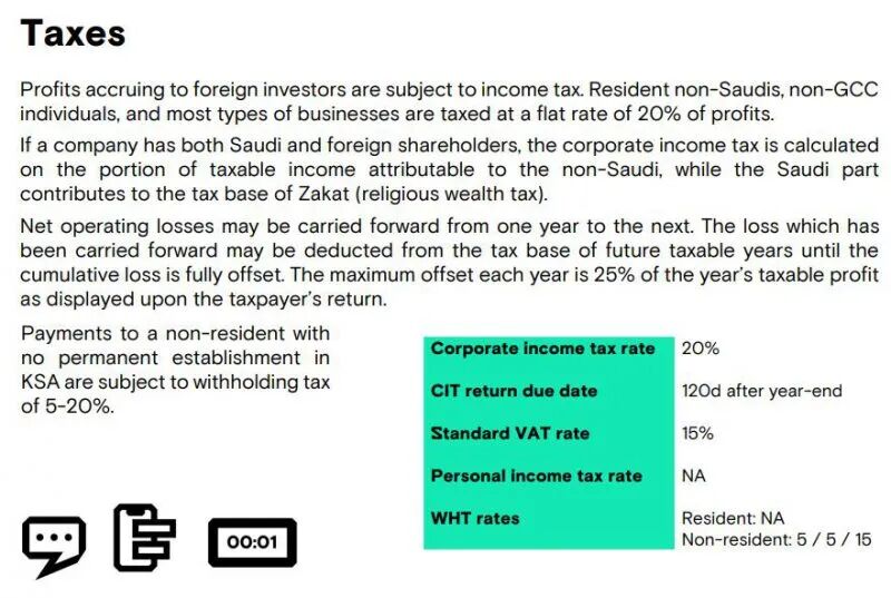 外国投资者的盈利需要缴纳所得税。非沙特、非海湾合作委员会国家居民、以及多数的商业类型将被收取盈利20%的税款。