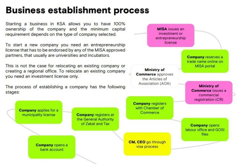 在沙特阿拉伯开设公司时,你可以获得公司100%的所有权,并满足最低的注册资本要求。你需要一个沙特阿拉伯投资部认证合作伙伴背书的执照,通常可以通过大学和孵化期来获得。