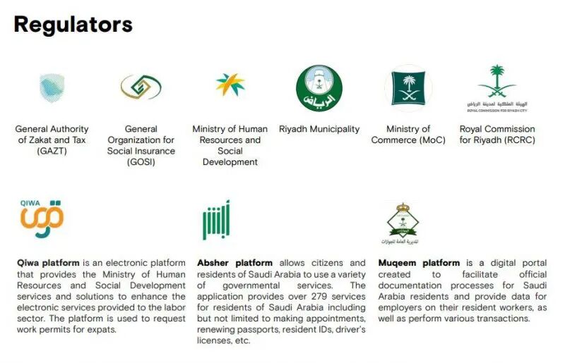 沙特阿拉伯的管理部门包括沙特阿拉伯税务局、社会保险总组织、人力资源和社会发展部、利雅得市政府、商务部、利雅得市皇家委员会等等。