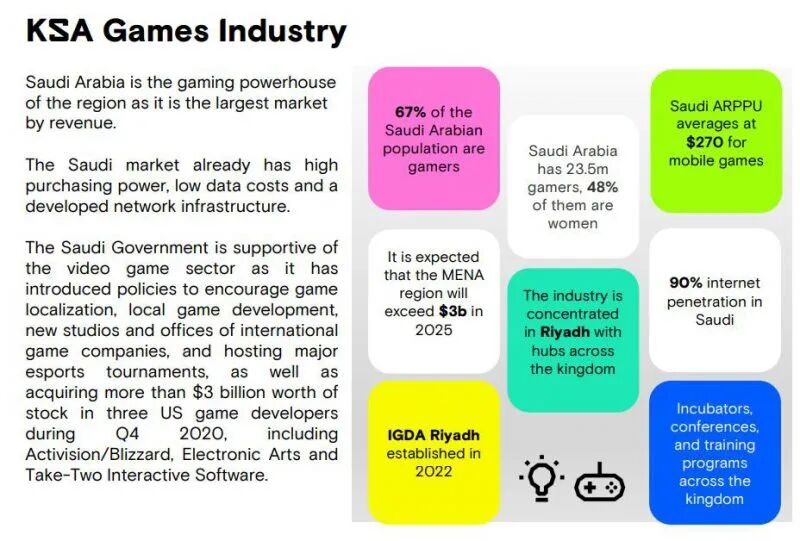 沙特阿拉伯拥有区域内营收额最高的市场,购买力高、数据开支低廉、拥有完善的网络基建设施。沙特阿拉伯政府鼓励电子游戏业的发展,并通过政策支持游戏本地化、本土游戏研发、新工作室成立、国际游戏公司迁入、电竞赛事的召开等等,并在2020年Q4向三家美国游戏公司动视暴雪、EA和Take-Two投资30亿美元。
