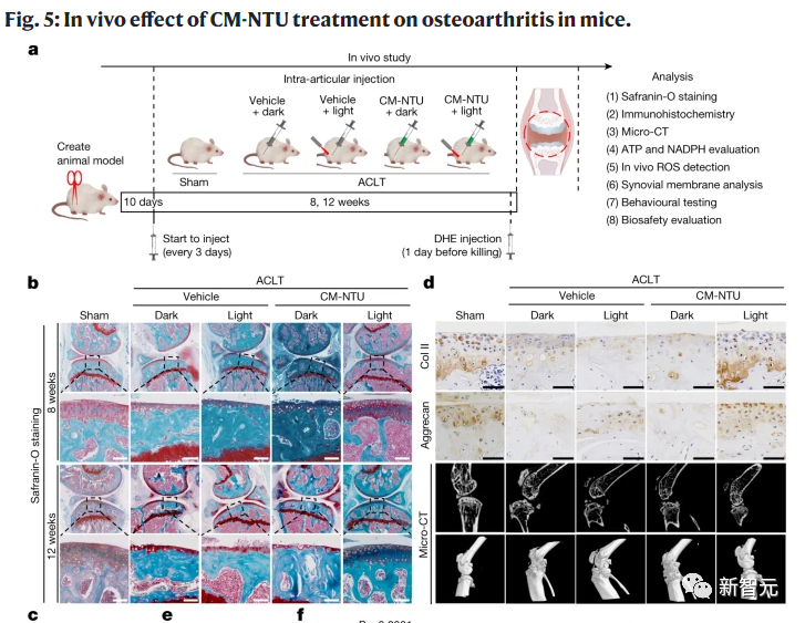 与ACLT对照组相比,接受ACLT并用CM-NTU和光处理的小鼠的评分显著降低(术后8周和12周分别为1.45和1.81)。