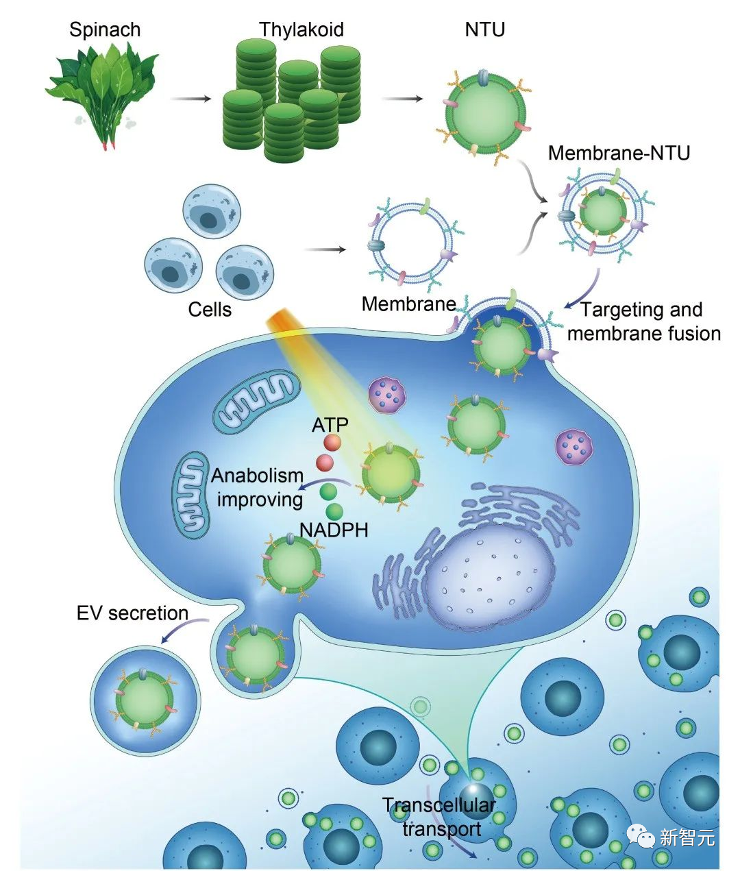 通过将动物细胞膜包裹于纳米化类囊体外层做伪装,他们首次实现了植物的类囊体跨物种递送到动物体衰老病变的细胞内,让动物细胞也能拥有植物光合作用的能量。